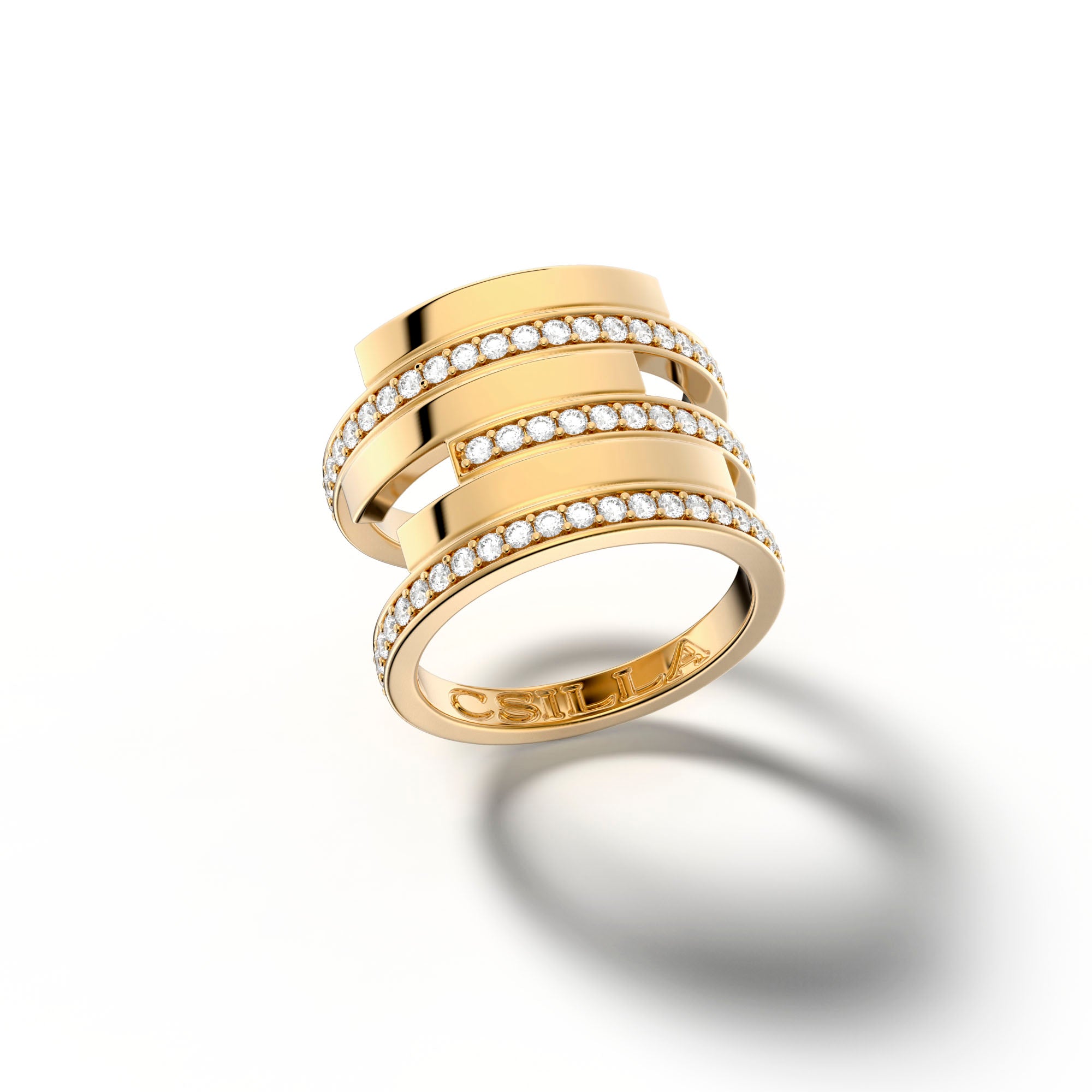 Spiral beauty represents the perfect imperfection in all of us. Wide 18k yellow gold ring with pretty diamonds. Comes in white, yellow and pink gold.